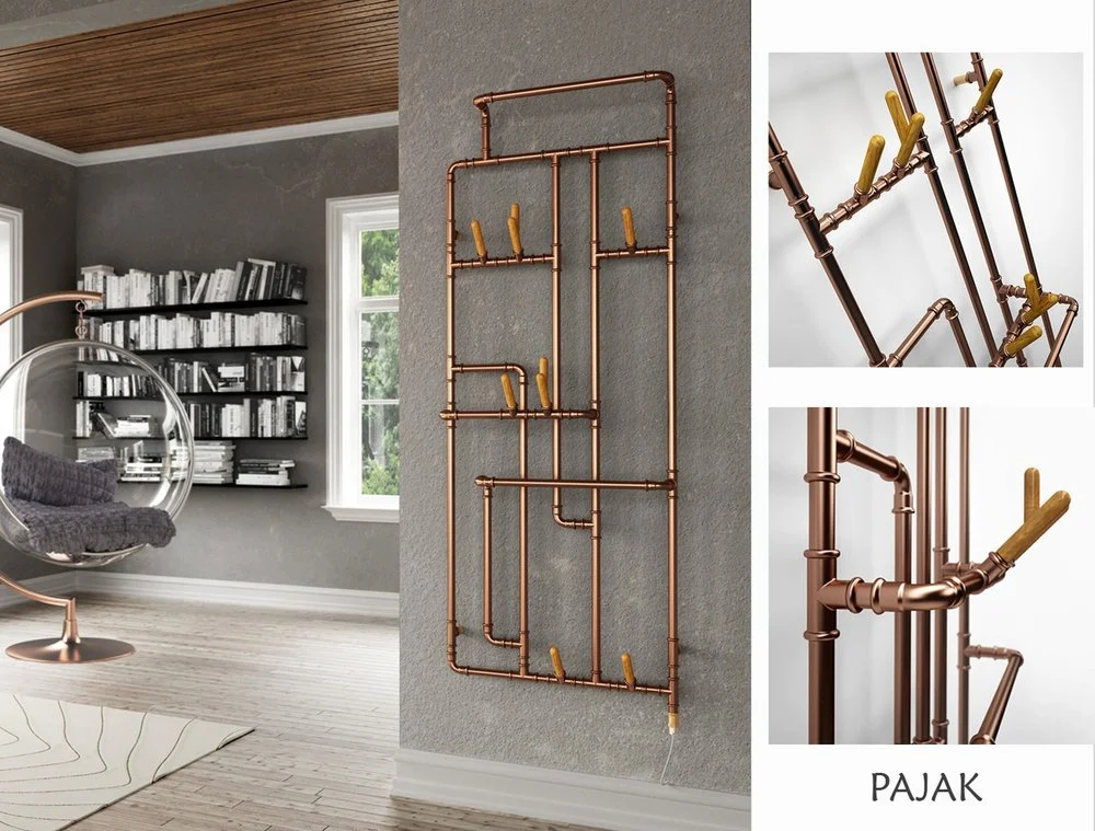 Design stilski radijator TERMA PAJAK dobitnik je nagrade na natjecanju 2014. i stravrno je poseban radiajtor. Izrađen je od bakra, bakrenih cijevi i okova, a njegova slika temelji se na složenoj prostornoj strukturi koja se sastoji od lako dostupnih komponenata. Savršeno se uklapa u moderne postindustrijske prostore. Uz dodatak drvenih vješalica (standardno, kao dio radijatora), lijepo se uklapa i u tradicionalne domove. Najčešće se montira u hodnike zbog svoje funkcionalnosti za vješanje sezonske odjeće . Priključak je moguć na: